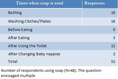 Hygiene practice and behaviour is very low. None of the respondents we asked uses soap before eating while only 21% use soap after using the toilet. Likewise, the use of soap after changing baby nappies was surprisingly low (see table).